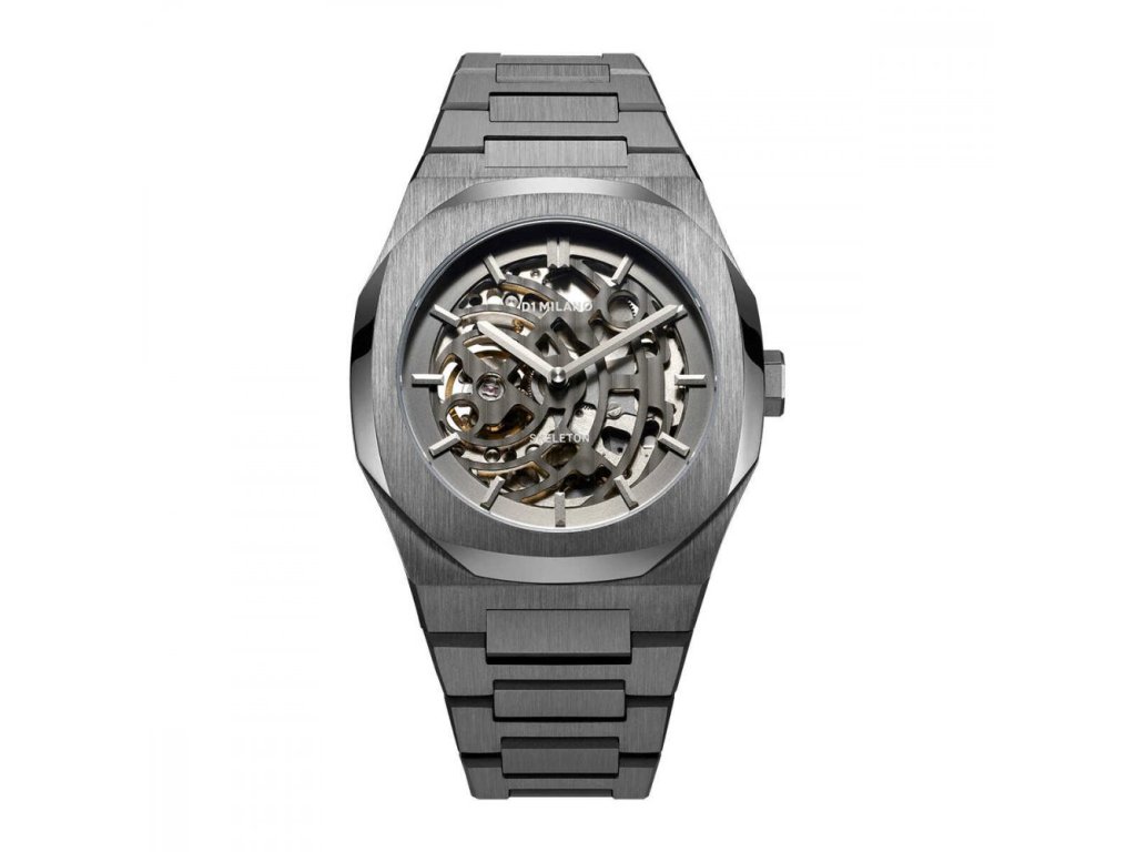 Men's grey D1 Milano watch with steel strap Mechanical skeleton Gun Metal 41,5 MM